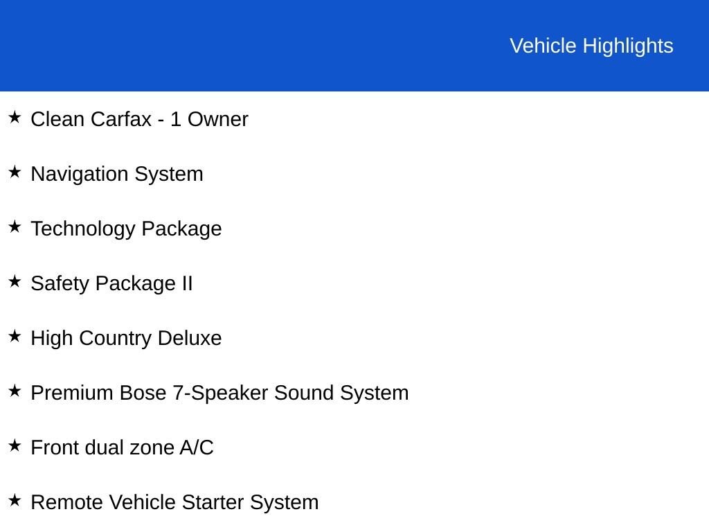 CARFAX One-Owner - CarBravo Certified - 4WD - Crew Cab - 6.2L V8 - High Country Deluxe Package - Technology Package - Power Sunroof - Navigation System - Leather Seats - Heated & Ventilated Front Seats - Heated Rear Seats - Heated Steering Wheel - Apple Carplay/Android Auto - Surround View Backup Camera - Spray-In Bedliner - Running Boards - Remote Engine Starter - Remote Keyless Entry - 22 Polished Aluminum Wheels - Certification Program Details: Car Bravo Certified Vehicles pass a 126 point inspection performed by a GM Dealer, Herb Connolly Chevrolet. This car comes with a factory 12 month - 12,000 mile bumper to bumper warranty with roadside assistance and courtesy transportation. Vehicle history report and 10 day or 500 mile vehicle exchange program available. Not all vehicles will qualify. Herb Connolly Motors is the home of used car LIVE MARKET PRICING. LIVE MARKET PRICING gives our customers the piece of mind that we have already done the shopping for you and priced our vehicle aggressively in today's internet information marketplace while adjusting accordingly for - Supply - Equipment - Condition and Mileage. Remember at Herb Connolly Motors - WE DONT PLAY PRICING GAMES. See dealer for details, some Car Bravo Certified Vehicles will require financing with GMF for special rates or rebates via GMF.