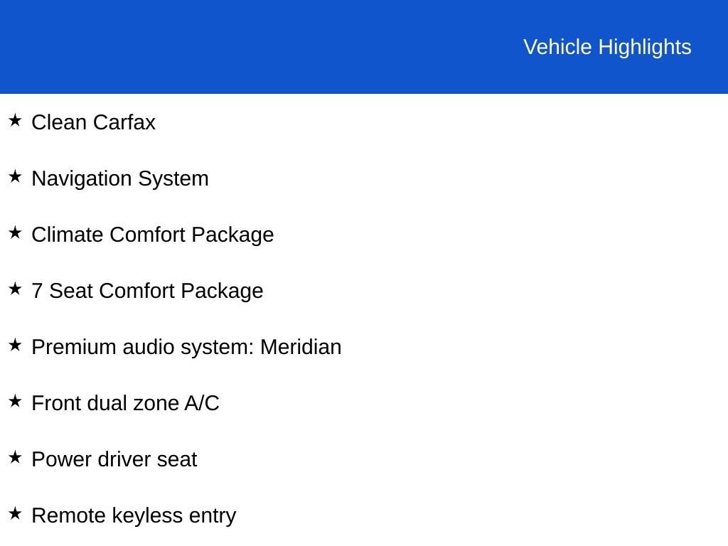 Clean CARFAX - 4WD - Climate Comfort Package - 7-Seat Comfort Package - Leather Seats - Heated Front & Rear Seats - Heated Steering Wheel - Meridian Premium Audio System - Navigation System - Power Moonroof - Backup Camera - 3rd Row Seating - Remote Keyless Entry - 20 Alloy Wheels - Herb Connolly Motors is the home of used car LIVE MARKET PRICING. LIVE MARKET PRICING gives our customers the piece of mind that we have already done the shopping for you and priced our vehicle aggressively in today's internet information marketplace while adjusting accordingly for - Supply - Equipment - Condition and Mileage. Remember at Herb Connolly Motors - WE DONT PLAY PRICING GAMES. See dealer for details, some Car Bravo Certified Vehicles will require financing with GMF for special rates or rebates via GMF.